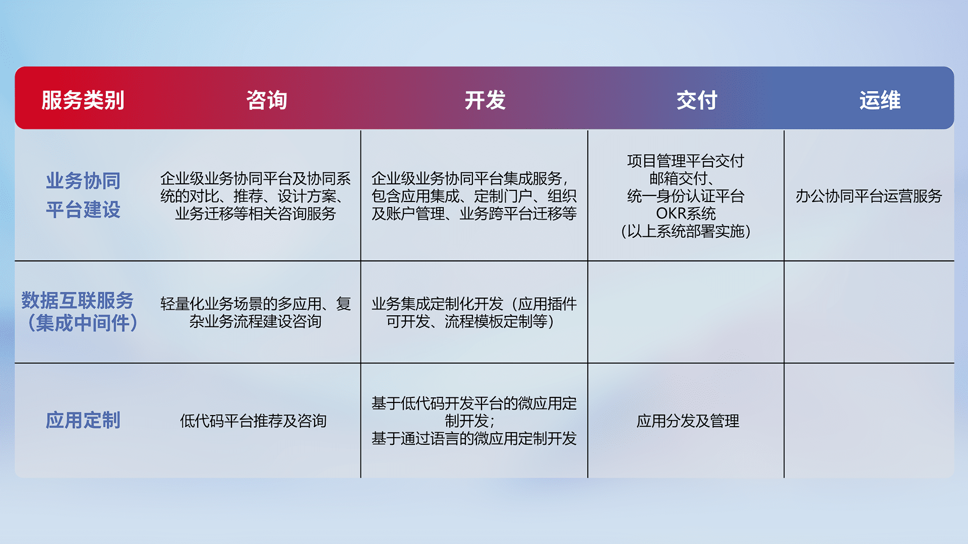 针对钉钉、、、、企微、、、IDaas等平台级产品提供产品的规划、、、方案、、、、交付、、、定制化开发等服务,,,,实现如统一协同办公、、智能客户服务、、、混合会议管理、、智能数据查询、、、等业务场景,,,实现数字化转型。。